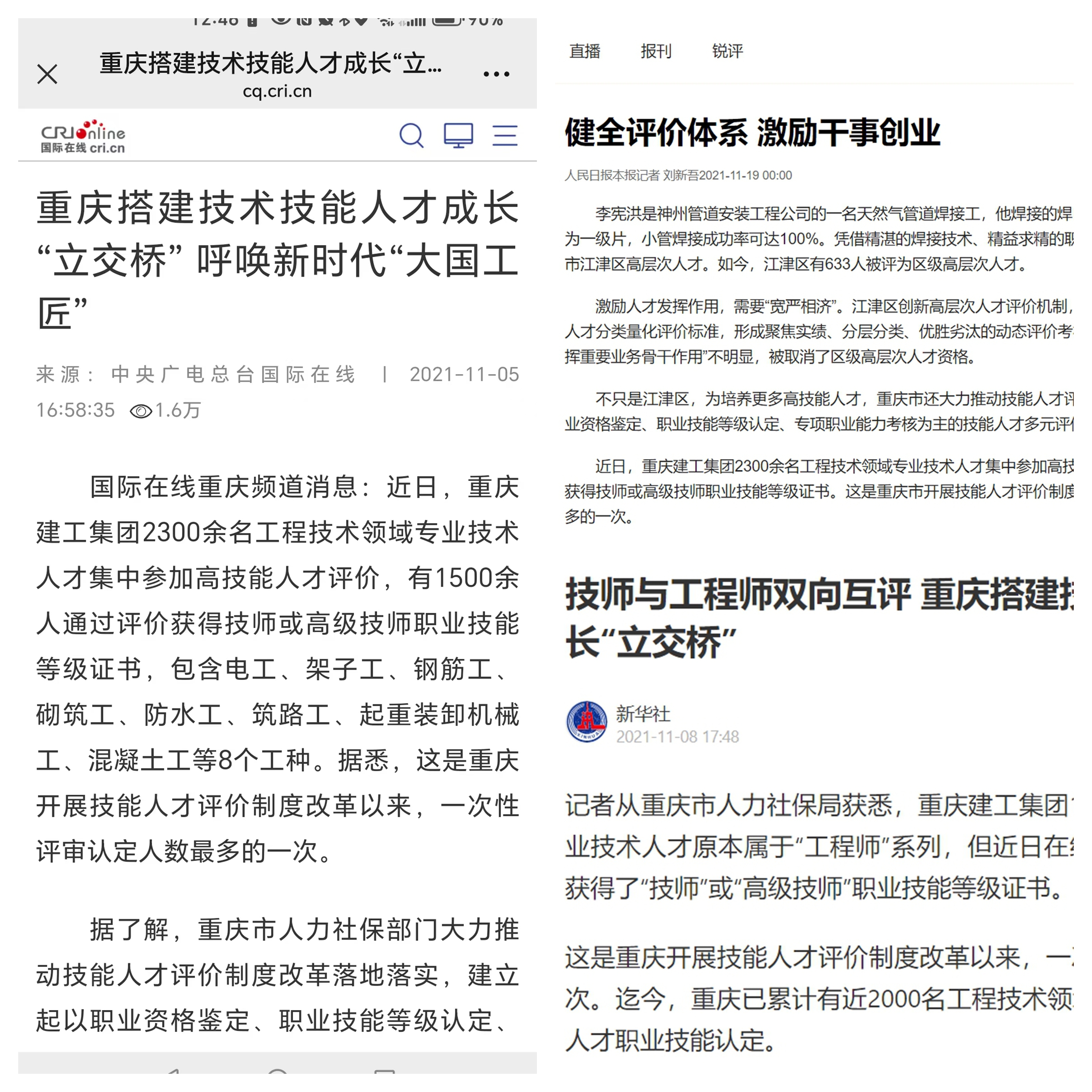 2021年,集團2300余名工程技術領域專業技術人才集中參加高技能人才評價,1500余人通過評價獲得技師或高級技師職業技能等級證書,成為我市開展技能人才評價制度改革以來,一次性評審認定人數最多的一次,評價人數規模位居重慶市第一位。該工作受到市人社局和市職業技能鑒定指導中心的充分肯定,也被新華社、中央廣電總臺、中國新聞網、重慶日報等近30家主流媒體的廣泛關注和報道。