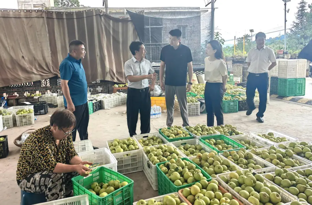 在堰塘翡翠梨采摘基地,魯學佳詳細了解了基地的年產量、品質、銷售渠道和衍生產品等情況。