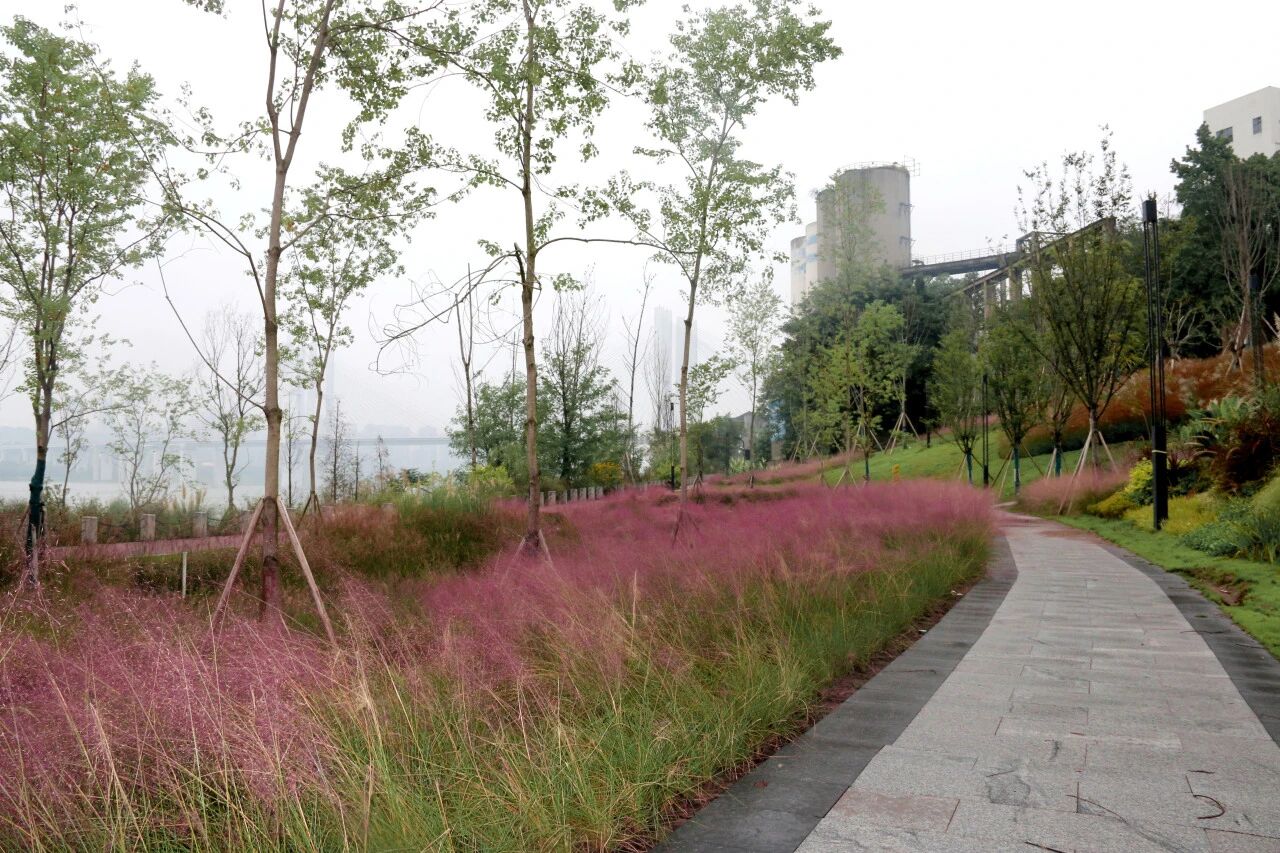 九龍半島段岸線起于漁秋浩碼頭,終于龍鳳寺,全線岸線長約6.8公里,面積約107.43萬平方米。地質條件復雜,季節性水位落差大,傳統的生態修復技術面臨嚴峻挑戰。項目團隊精準施策,巧妙采用了分級、分區域生態治理方案。在水位變動劇烈的消落帶,重慶建工三建公司的項目團隊攻克了土壤固結與植物存活難題,通過清渣換填、格賓網箱固土技術,并成功規模化種植秋華柳、卡開蘆等耐水植物,打造了一道“會呼吸”的生態屏障。在高程區域,優選本土植物,采用階梯式覆綠工藝,打造出四季有景、層次豐富的濱江綠化帶,顯著提升了區域的生態涵養能力。