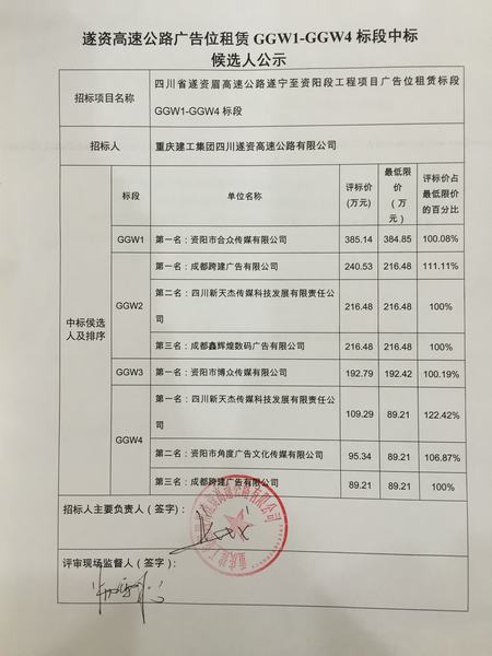 遂資高速公路廣告位租賃GGW1-GGW4標段中標候選人公示
