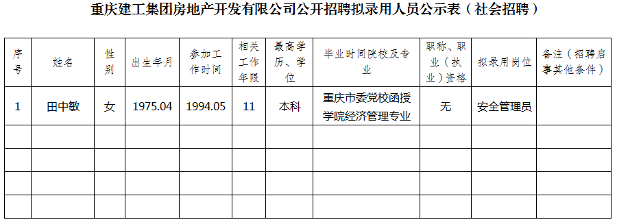 按照重慶建工集團員工招聘管理辦法相關規定,重慶建工集團房地產開發有限公司招聘啟事,經公開招聘,現將擬聘用人員予以公示。